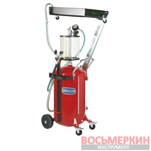 Передвижной резервуар для отсоса и слива отработанного масла, объемом 80 л с 10-ти литровой колбой, 10-ти литровой чашей с пантографом из окрашенной стали оснащен индикатором уровня, комплектом из 6-ти зондов разных диаметров для отсоса и инструментальным лотком, пневматическое опорожнение резервуара.