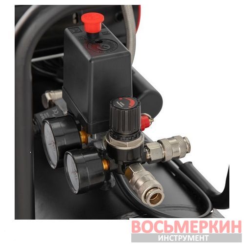 Для регулировки давления в ресивере и на выходе установлены два манометра с редуктором, что позволяет регулировать и постоянно поддерживать выходное давление необходимое вашему инструменту или оборудованию.