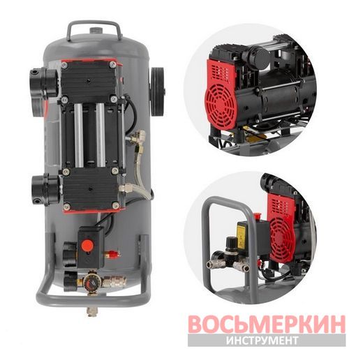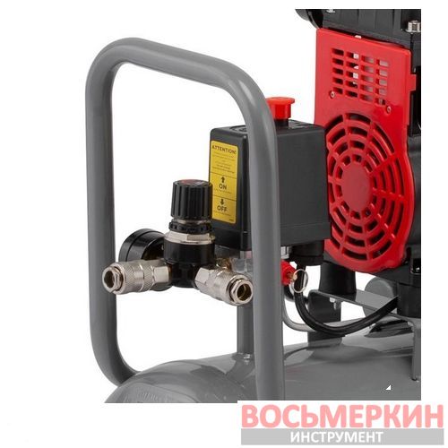 Отличительной чертой безмасляного компрессора является работа без использования смазки поршневой системы, а также низкий уровень шума 68 дБ. Вам не нужно каждый раз контролировать уровень масла, в итоге компрессор очень простой в обслуживании. Для регулировки давления в ресивере и на выходе установлены два манометра с редуктором, что позволяет регулировать и постоянно поддерживать выходное давление необходимое вашему инструменту или оборудованию.
