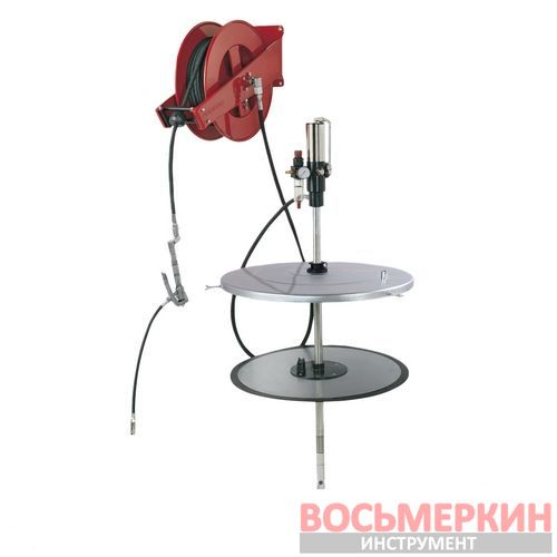 Комплект для пневматической раздачи смазок подходит для бочек 180 кг и может использоваться как в помещениях, так и вне помещений. Максимально достигаемое давление 400 бар.