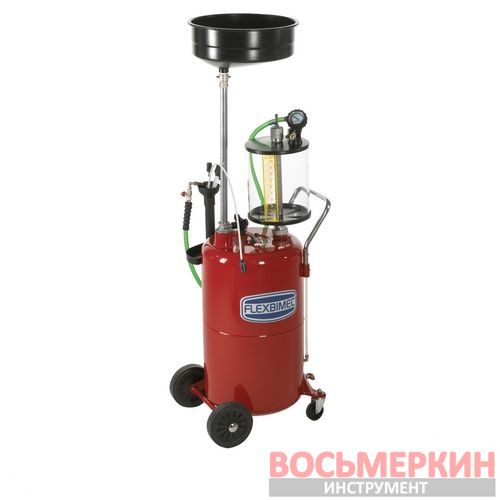 Передвижной резервуар для отсоса и слива отработанного масла, объемом 80 л с прозрачной 10-ти литровой колбой и 10-ти литровой воронкой из окрашенной стали с прямой подачей в резервуар оснащен индикатором уровня, комплектом из 6-ти зондов разных диаметров для отсоса и инструментальным лотком.