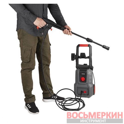 Широкая эргономичная ручка на корпусе обеспечивает комфорт при транспортировке и перемещении по участку. На ручке предусмотрен крюк для компактного хранения шланга высокого давления, теперь он не будет занимать место и не будет мешать другим предметам, гарантируя удобную работу с мойкой.
