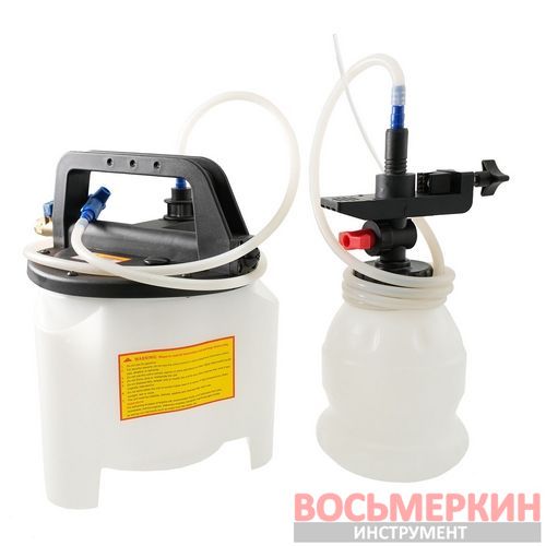 - Два отдельных резервуара: 2 литра для заливки новой тормозной жидкости, 1 литр для сбора отработанной жидкости.