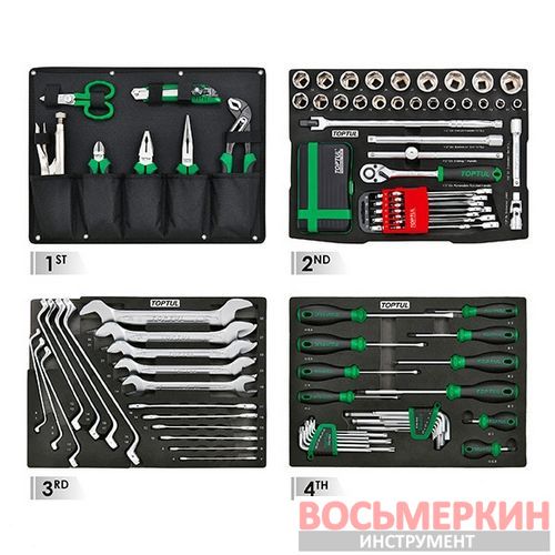 Этот набор обеспечивает широкий спектр инструментов для различных задач, от базовых ремонтных работ до профессионального обслуживания. Благодаря продуманной организации и высококачественным материалам, TOPTUL GCZ-134A станет надежным помощником в вашей работе.